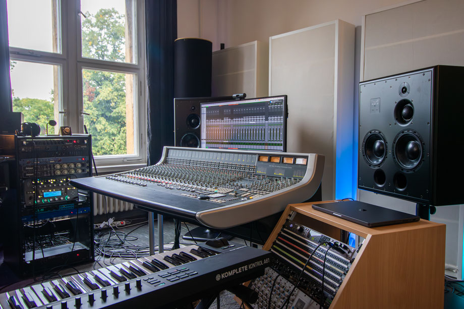 Our Berlin Studio is housed in the historic Tempelhof Airport, just steps from vibrant Kreuzberg. The spacious control room features abundant daylight, an SSL console, and a curated selection of